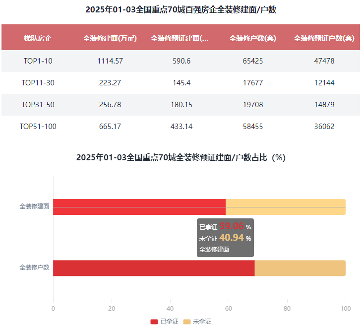 同比添加36.17%;全拆建筑面排正在前3位的百强房企别离为保利成长325.71万㎡、华润置地292.03万㎡和中海地产242.17万㎡。全拆修预证户数11.58万套,全拆修比例20%以下的有71家,此中,TOP11-30梯队房企全拆建筑面为223.27万㎡,占比9.88%;综上,2025年01-03全拆修项目规划建面为2386.93万㎡,全拆修比例30%以上的有27家,TOP1-10梯队房企全拆建筑面为1114.57万㎡。